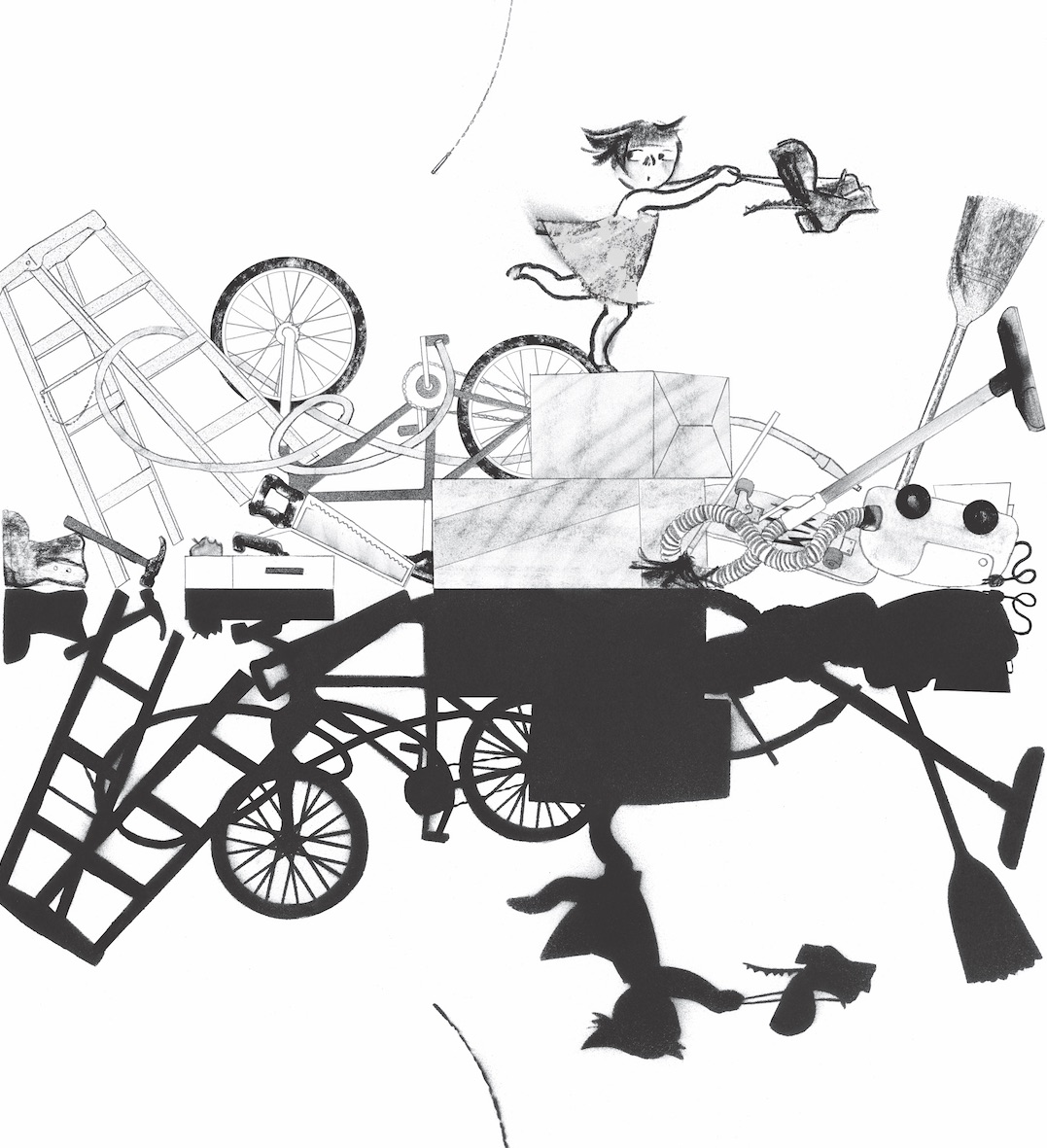 Si me dejo llevar a la hora de desarrollar la historia, en ocasiones acaba tomando la forma de álbum ilustrado sin palabras. Ciertas historias se me ocurren en forma de imágenes. Incluso hay veces en las que me limito a añadir historias a las imágenes que me apetece utilizar. En ocasiones pienso que contar historias puede ser una excusa para mostrar ciertas imágenes. Cuando sitúo una imagen al lado de la otra, aparece una historia entre ellas como por arte de magia. En ese punto, lo importante no es cada imagen por separado, sino la historia que crean en conjunto. Cuando distribuyo las imágenes y las altero, la historia empieza a desarrollarse sola gracias al poder de cada imagen. Ya no queda nada por poner o quitar,el libro está terminado. Incluir palabras en este álbum ilustrado completo sería como añadir una ilustración a un poema. Un poema ilustrado es excesivo, puesto que entorpece el ensueño del lector y elimina la posibilidad de imaginar a partir de unas palabras poéticas. Ciertas historias piden ser explicadas con el lenguaje de las imágenes y tratadas con la lógica visual. Esas historias suelen ocurrírseles de forma natural a los creadores más acostumbrados a pensar de manera visual. Si primero hubiera existido un texto tipo «hay un espejo» y luego hubiera venido la ilustración para el texto, Espejo habría sido un libro bastante diferente. Por otro lado, si el motivo del proyecto ya es visual como «la página opuesta es un espejo», de forma natural nos lleva a contar la historia de un modo visual y es probable que el proyecto termine adoptando la forma de un libro sin palabras.