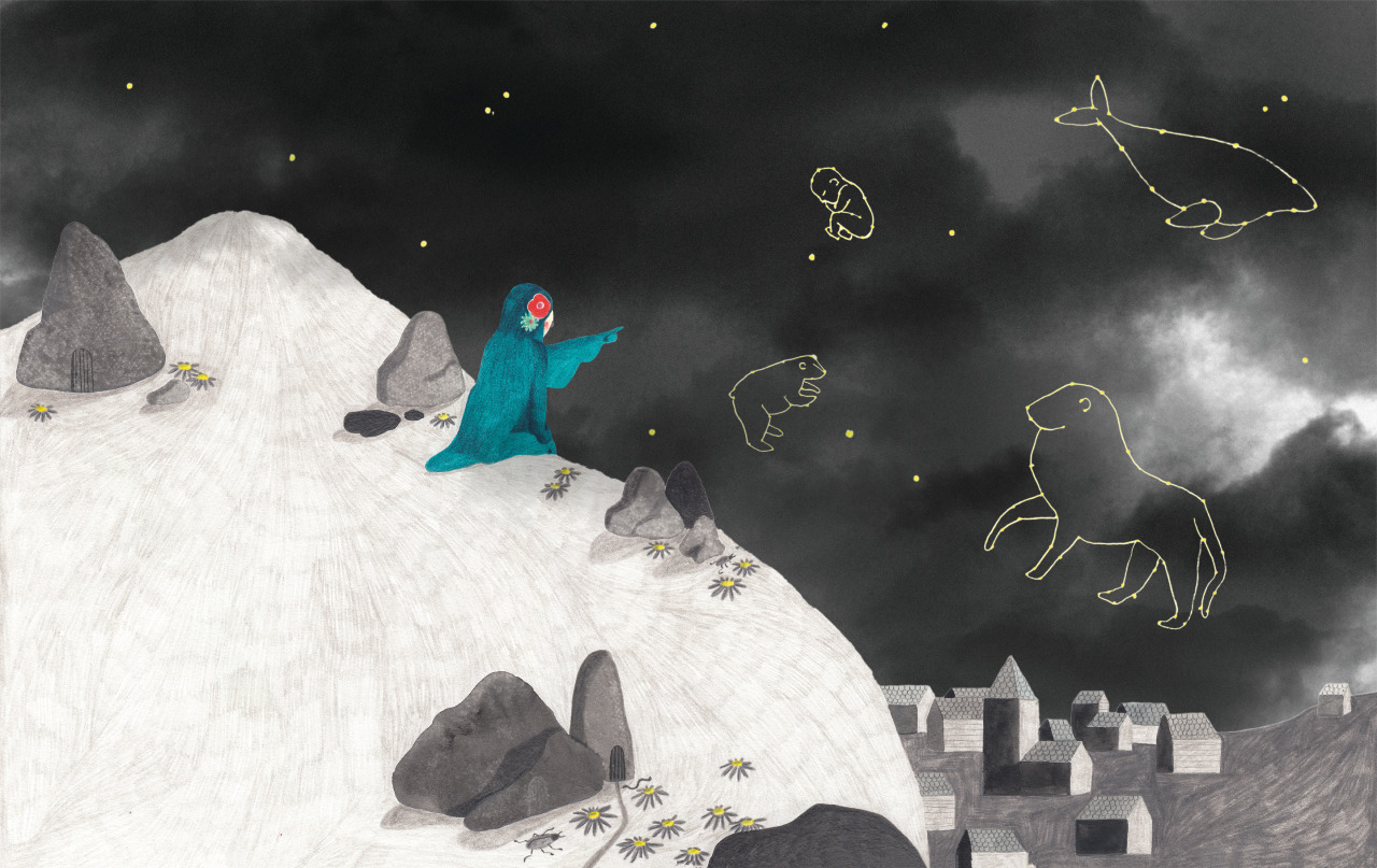 ¿Cuál fue el mayor reto a la hora de ilustrar estos libros? Supongo que fue definir el aspecto que tendrían los personajes de la Muerte y la Vida. Todos coincidimos en que la Muerte tenía que ser diferente de la emblemática figura negra con una guadaña desde el principio. Como el texto es tan fuerte, las imágenes tenían que ser muy coloridas y juguetonas. Conseguí definir el personaje de la Muerte, después de llenar páginas y páginas de mi cuaderno de bocetos. El personaje de la Vida, por alguna razón, fue más fácil. Su personaje es tal vez menos "fuerte" que la muerte, pero traté de hacer que los escenarios contaran la historia y causaran un impacto en el lector. El libro de la Muerte, también fue un desafío, ya que era mi primer libro álbum. A pesar de que sabía que quería ser ilustradora de libros infantiles desde muy temprana edad, me preguntaba: ¿podré hacerlo? ¿Se convertirá en un hermoso libro que los niños quieren coger de su estantería? Después de hacer el primero, me encantó tanto el proceso que estuve aún más segura de que ¡yo había nacido para esto! Uno de los momentos más emotivos en la historia de Soy la muerte es cuando se habla de la muerte de los neonatos, algo totalmente nuevo que enfrenta con valentía una realidad. La imagen que acompaña esta parte del texto es una de las imágenes emblemáticas de este álbum. ¿Qué pensaste al leer está parte del texto y cómo llegaste a la imagen de la constelación? En Bélgica, de donde soy, no somos tan abiertos a la hora de hablar sobre la muerte. La escondemos, o usamos otras palabras para describirla. ¡Imagínate cuando leí esa parte del texto! Pensé, espera un minuto, ¿este libro es realmente para niños? ¿Cómo reaccionarán los lectores? Fue un poco chocante para mí, pero después de reflexionar sobre ello, pensé que, si vamos a hacer un libro sobre la muerte, hablando de todas las formas y las ocasiones en que la muerte viene, hablar de los bebés no nacidos era absolutamente necesario. También fue muy difícil encontrar la manera correcta de ilustrar un texto tan poderoso: al principio, la imagen era la misma que ahora, pero sin la pequeña constelación del bebé. Svein, el editor de Magikon, sugirió que la imagen sería más potente si el bebé fuera una constelación. ¡Pensé que era una idea brillante!