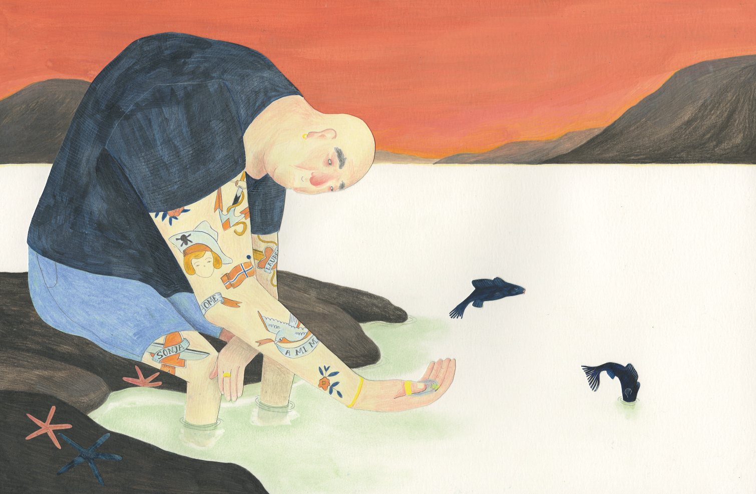 ¿Con qué parte del texto de los dos libros te quedarías? Mientras hacía el libro de la Vida, murió un muy buen amigo mío, y pensé que si la representaba en el libro, la mantendría viva en cierto modo. En la página con el marinero, tatué su nombre en su brazo. Es una ilustración muy especial para mí, y siempre lo será. Soy la vida / Soy la Muerte Elizabeth Hellan Larsen y Marine Schneider