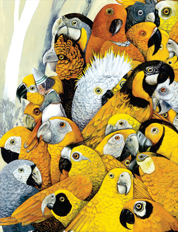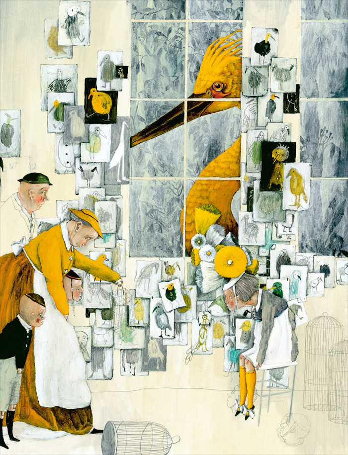 A causa de su amarga soledad, la princesa colecciona objetos, pero sobre todo: pájaros. Cientos de maravillosos y exuberantes pájaros enjaulados, que se convierten en su lujoso capricho, exóticos ejemplares alados, símbolos de su soledad. Animales tan exóticos que solo viven en la imaginación de Valentina. Los sirvientes viajan por remotos y desolados lugares para encontrar los pájaros más esplendidos y para contentar los deseos de Valentina. Durante los intrépidos viajes algunos pierden la vida otros al volver son decapitados. Hasta que un sirviente, con inteligencia y astucia, le regala algo inesperado: el huevo de un pájaro que habla. La felicidad y la esperanza iluminan la vida de Valentina. Tendrá que cuidar del huevo con cariño hasta que se abra. La historia de la caprichosa Valentina, prisionera de su pajarera de oro, contiene un precioso mensaje: que no se puede tener todo lo que se desea; la codicia de la solitaria niña esconde la necesidad de llenar un vacío de sentimientos que los coloridos pájaros no pueden llenar. Valentina aprenderá la virtud de la paciencia y de la perseverancia. La pajarera de oro, Anna Castagnoli y Carll Cneut