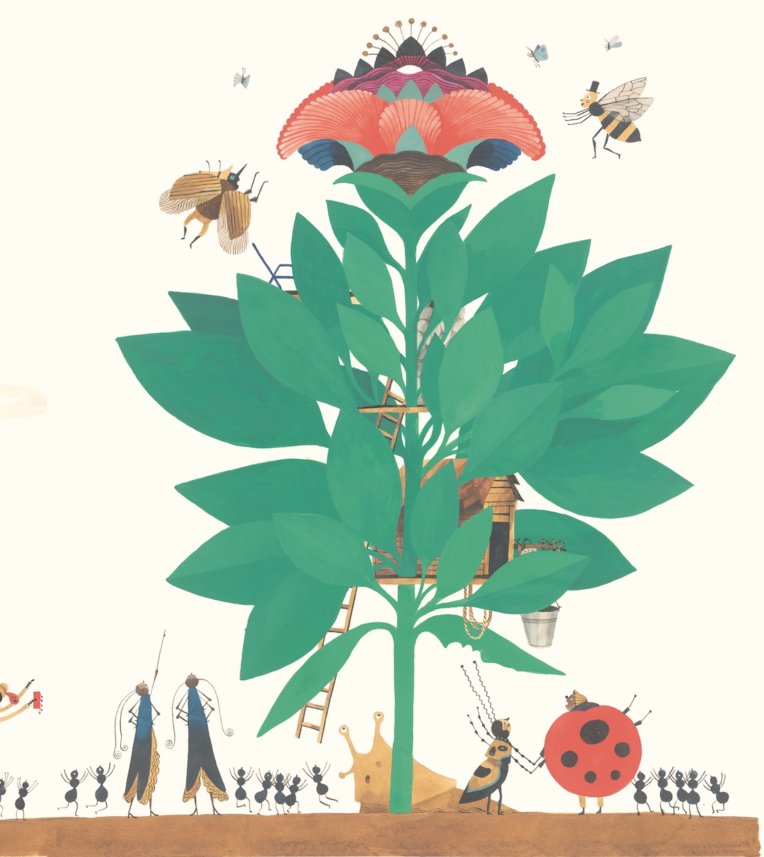 La fortaleza se derrumba y los insectos no parecen terriblemente perturbados, quizás porque saben que este es el camino natural, quizás porque saben que ellos también compartirán pronto el destino de la flor en este imparable ciclo de la vida, se despiden y se van. Llega la noche, luego el otoño trae su propia magia mientras el mundo realiza silenciosamente su eterno deber de agitar el ciclo de crecimiento y decadencia. Los restos de la flor marchita se hunden en el lecho del bosque mientras una serenata nocturna se despliega por encima antes de que una manta de nieve silencie el bosque. En las páginas finales, vemos la llegada de la primavera con su recompensa redentora para revelar no un brote sino la promesa de todo un jardín de flores. ¿Mau Iz Io? exclama un nuevo insecto que entra en escena; una amable invitación a reflexionar sobre adónde han ido los otros como las estaciones que se suceden, presentando una sutil oportunidad para los padres de abordar el ciclo de la vida. María Papova, Brian Pickings
