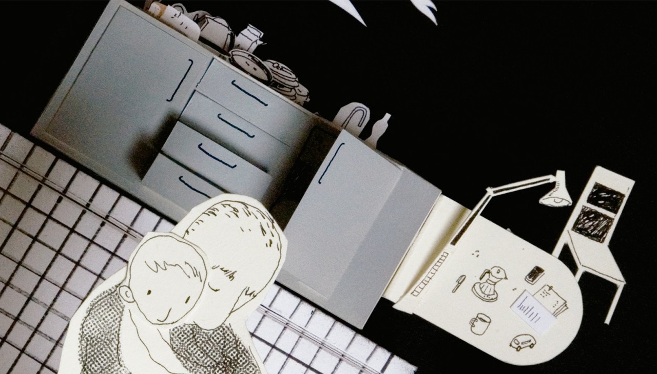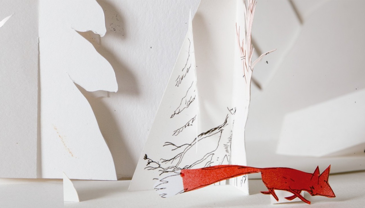 Las ilustraciones de Torseter para este libro son, quizás, las más alejadas del estilo al que nos tiene acostumbrados. Aún así, seguimos reconociendo al artista noruego en cada imagen. En lugar de su habitual dibujo tembloroso y detallado, construye, literalmente, las imágenes con dioramas de papel que luego fotografía. Mantiene su expresividad en el dibujo sobre algunos papeles, las manchas de carboncillo o pintura que aportan sombras y texturas. Las imágenes de Torseter evocan ese ambiente que transmite el texto: podemos percibir la ausencia, el frío y el silencio solo con verlas. Lo consigue con la composición de la escena, los colores, blancos y grises salvo por el zorro rojo que camina por el exterior. Ese tono rojo transmite la calidez perdida, que quizás en algún momento puedan recuperar dentro del hogar.