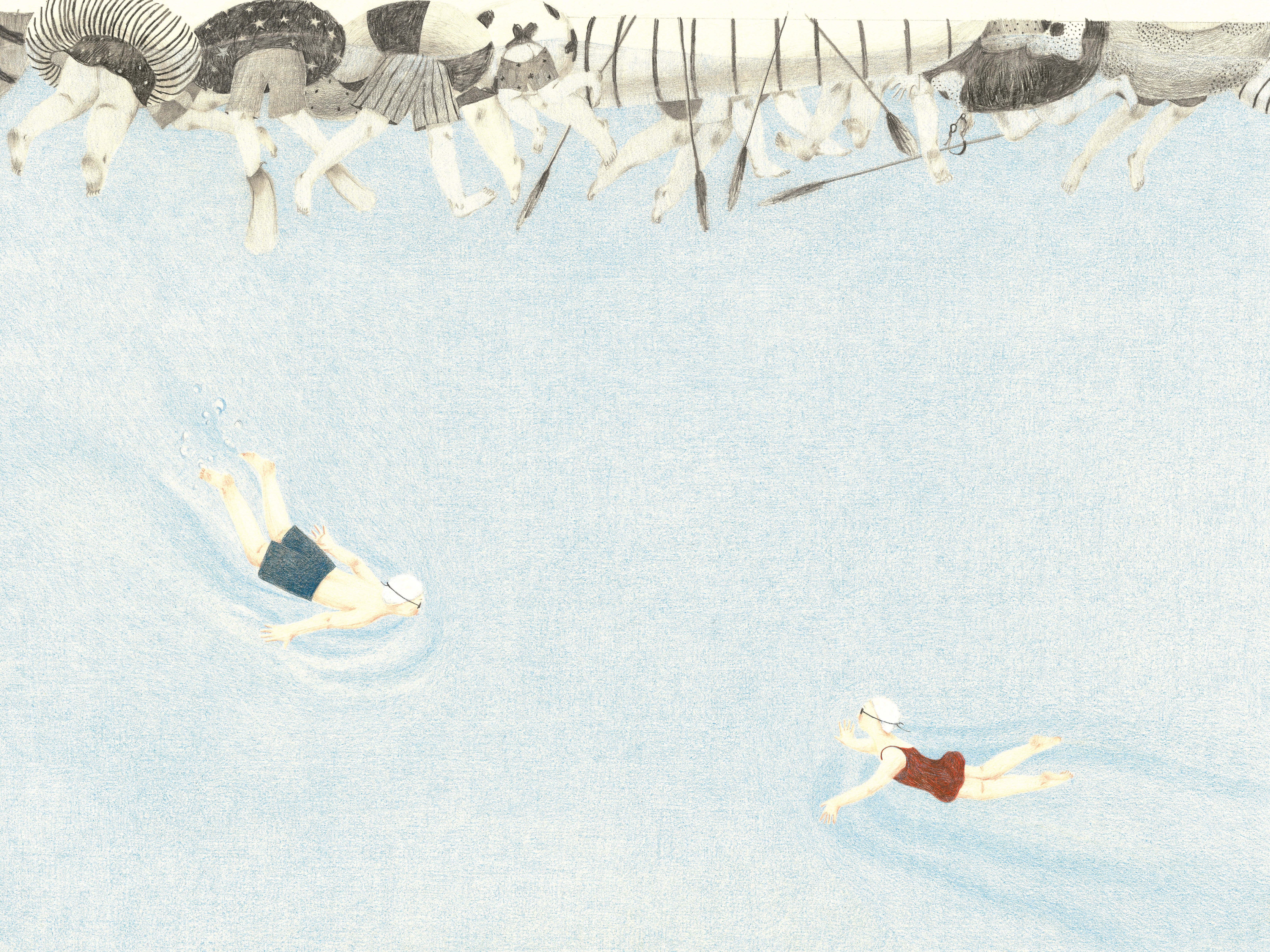 Cheese, Zuzu (2020)[/caption] 3. La piscina como refugio | La piscina, Ji Hyeon Lee (2014) Cuando el calor aprieta y el plato de ducha no da para un chapuzón no queda otra que acudir a la piscina municipal. En este sencillo libro sin palabras Ji Hyeon Lee huye dibuja a un chico que huye de la superpoblación de la piscina comunitaria buceando hacia el fondo, descubriendo así, junto a otra chica, la vida secreta de las profundidades. Los tonos claros y el suave trazo del lápiz transmite una calma inusitada en esos lugares de bullicio habitual. [caption id="attachment_14539" align="aligncenter" width="660"]