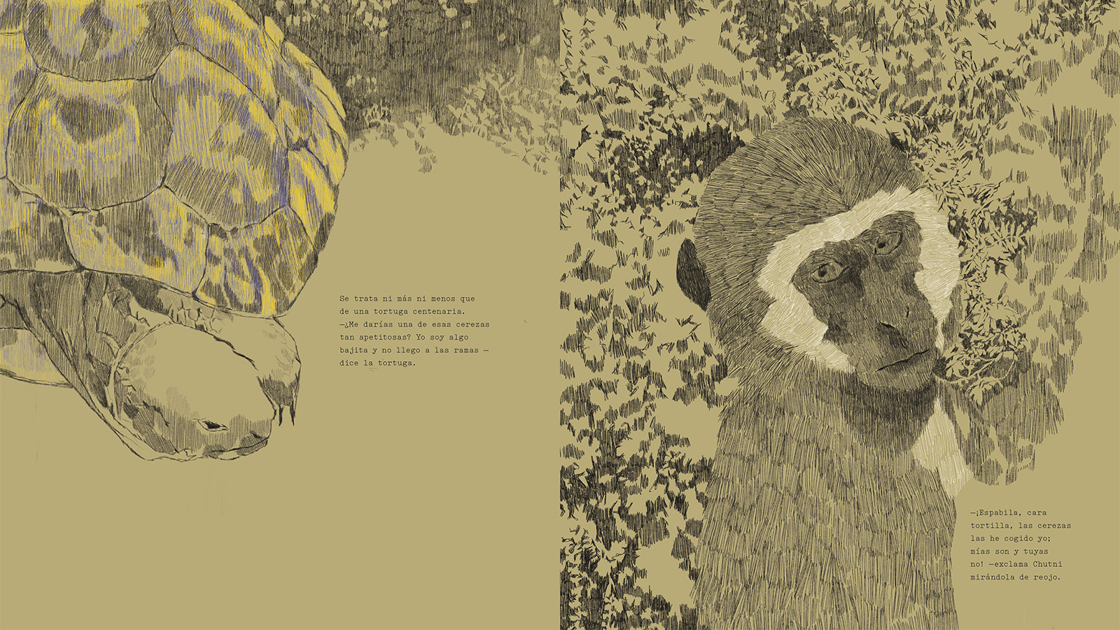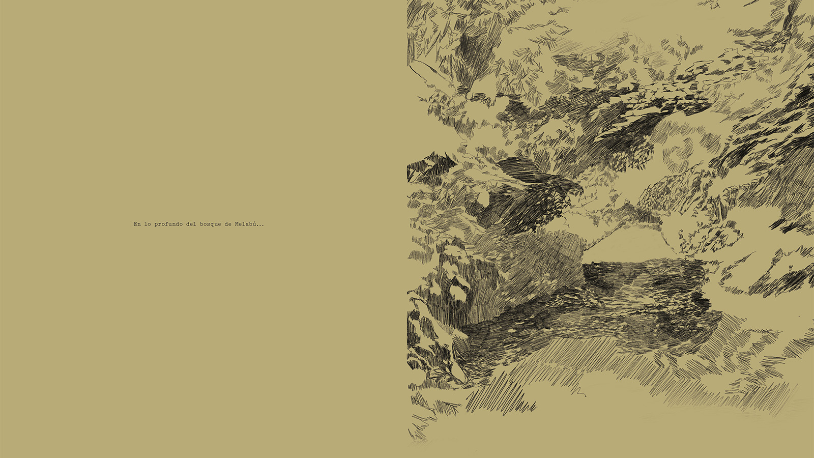 Los lápices de Bruna crean escenas etéreas con esa textura tan personal y una paleta de color terrosa. El conjunto nos transporta directamente al bosque de Melabú, con sus luces y sus sombras.